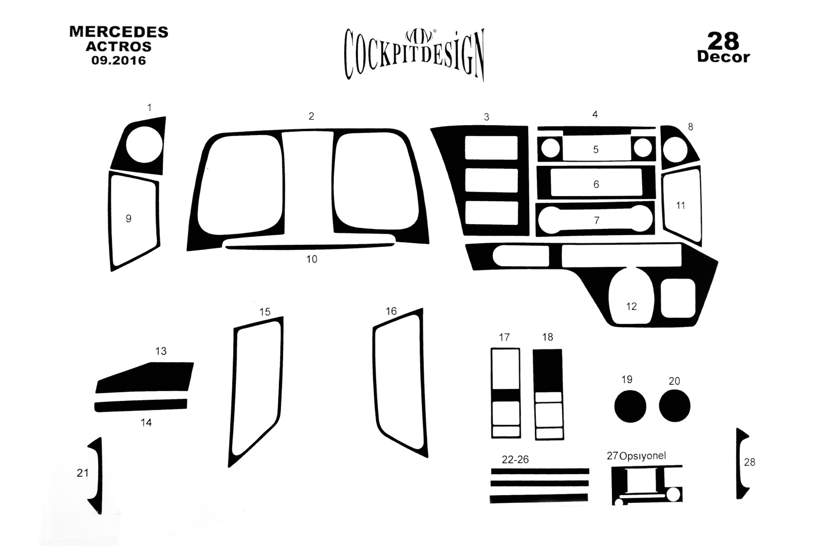 Накладки на панель Mercedes Actros MP4 2016-2020 (Meric, 28 деталей) 94000055