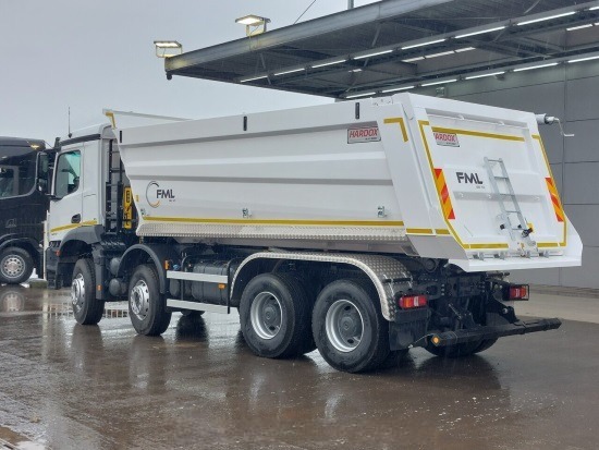 Екстер'єр вирізняється брутальним дизайном Arocs: потужна решітка радіатора, високий кліренс, захисні елементи та масивний сталевий бампер. LED-денні вогні та компактні габарити забезпечують хорошу маневреність на будівельному майданчику. Кузов Wielton (20 куб. м) виглядає солідно та функціонально.