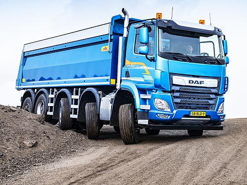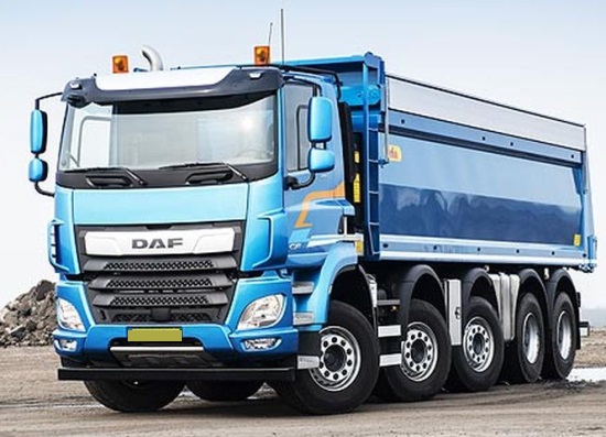 Екстер'єр DAF CF 480 FAD: Міцна рама з аеродинамічним дизайном кабіни, третя керована вісь для маневреності. Кузов зі сталі з гідравлічним підйомом, захисні елементи від бруду та ударів. Компактні габарити для кар'єрних трас, відмінний огляд завдяки високим вікнам.